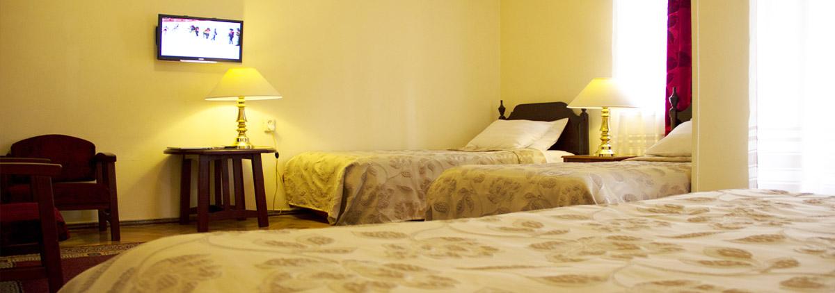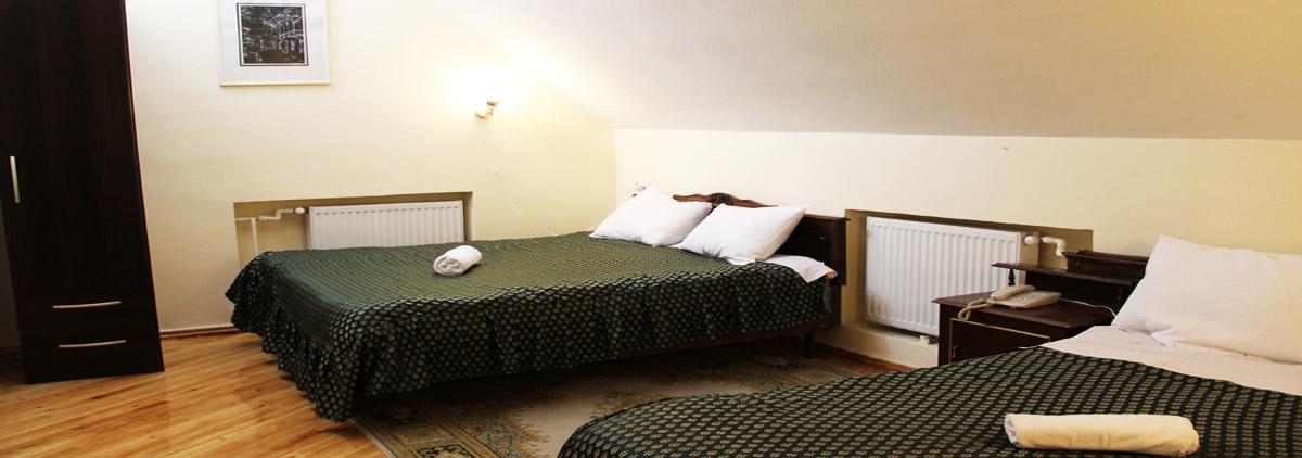 ნომერში დგას 1 ორადგილიანი და 2 ერთადგილიანი საწოლი და შესაძლებებლია 4-5 ადამიანის განთავსება ერთდროულად.