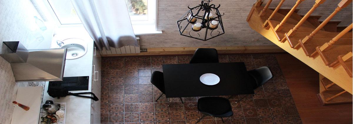Большая гостиная разделена на 2 зоны: Кухня-столовая и зона отдыха. Кухня оснащена столовым, чайным, кофейным сервизами и посудой необходимой для кухни.